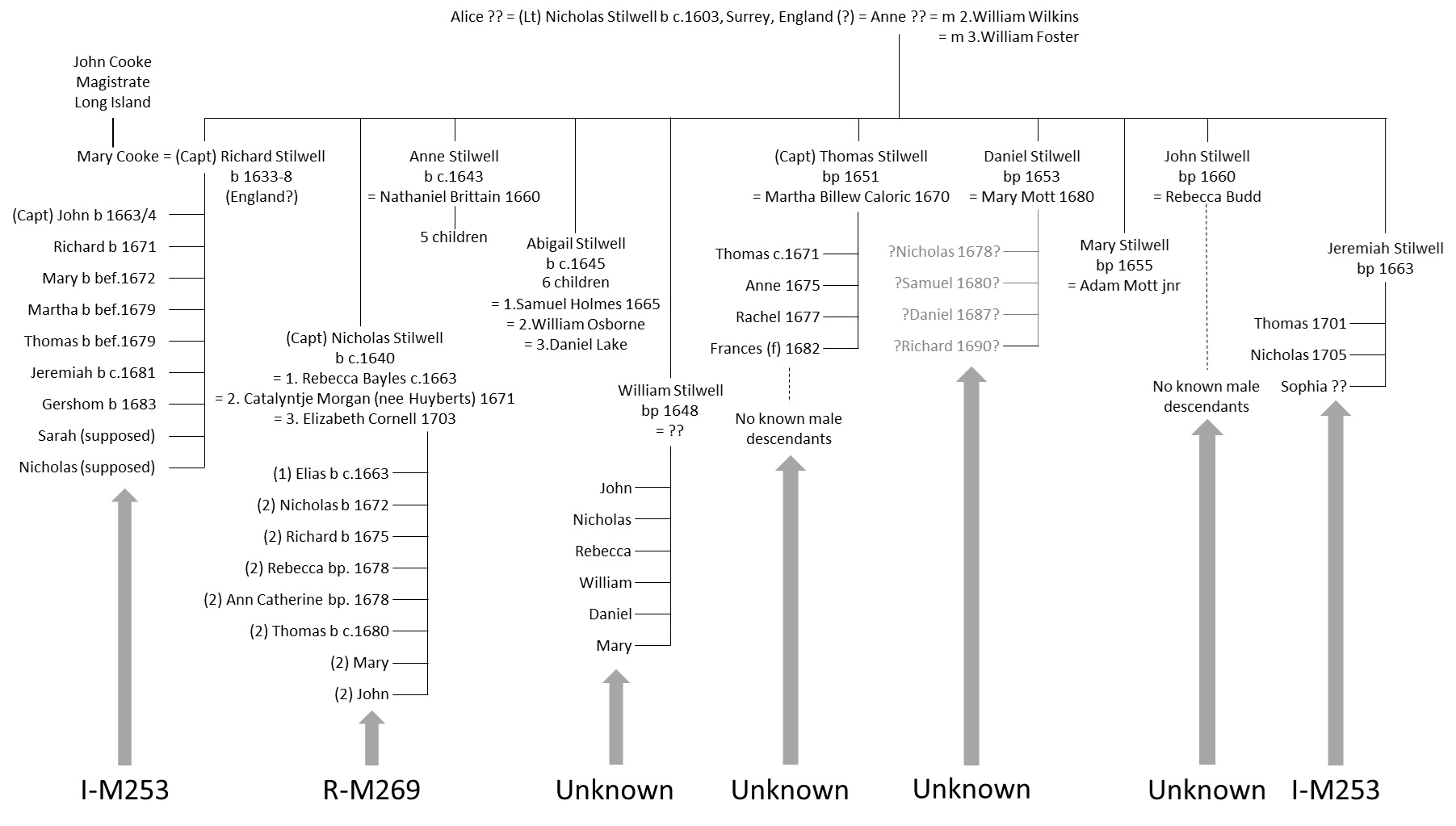 DNA tests carried out in USA and England threw up very unexpected results. Some US Stilwells have the British Stilwell family DNA signature (I-M253) and some have a completely different DNA signature (R-M269). This was unexpected. All those in USA who took part in the DNA project could trace their line back to Nicholas Stilwell. But the difference between them was the child of Nicholas who they descended from. The image below shows the results known so far.