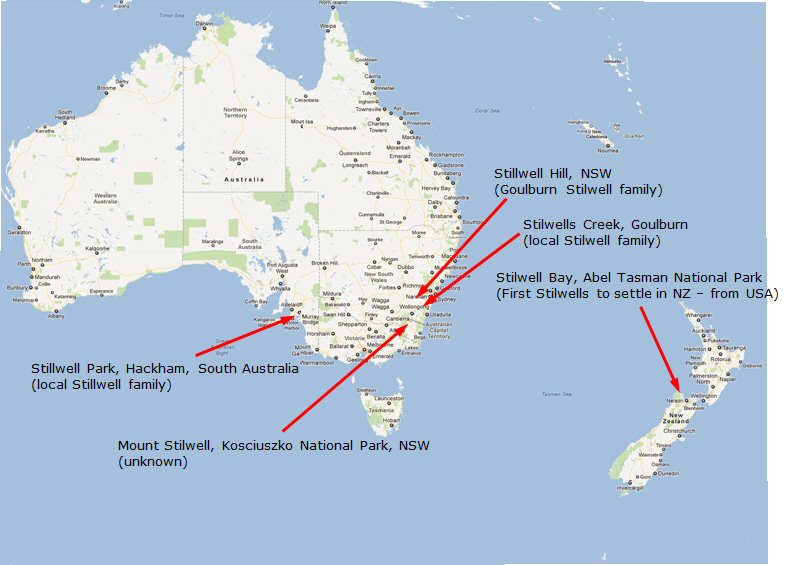 A number of city roads in Australia and geological features in Antarctica (yes, Antarctica) are named after Australian geologist Frank Leslie Stillwell. As regards the Stilwell/Stillwell place names in Australia and New Zealand, these are named after locals who stamped their identify on the area they lived in.